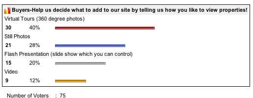 So I went ahead and implemented the poll. Although the numbers of voters wasn't huge, I began to notice a trend immediately. As I suspected, still photos were high on the priority list, but virtual tours came out #1 and real estate video, the darling of the media of late, came in last with only 12% of the votes.